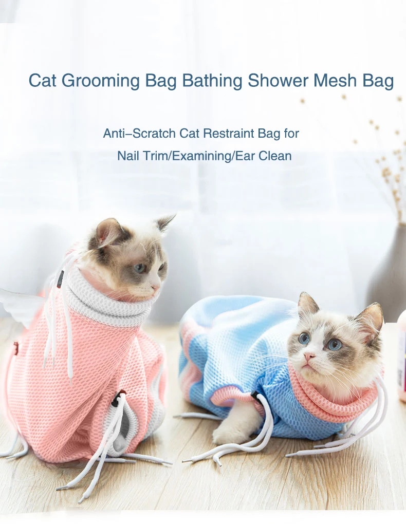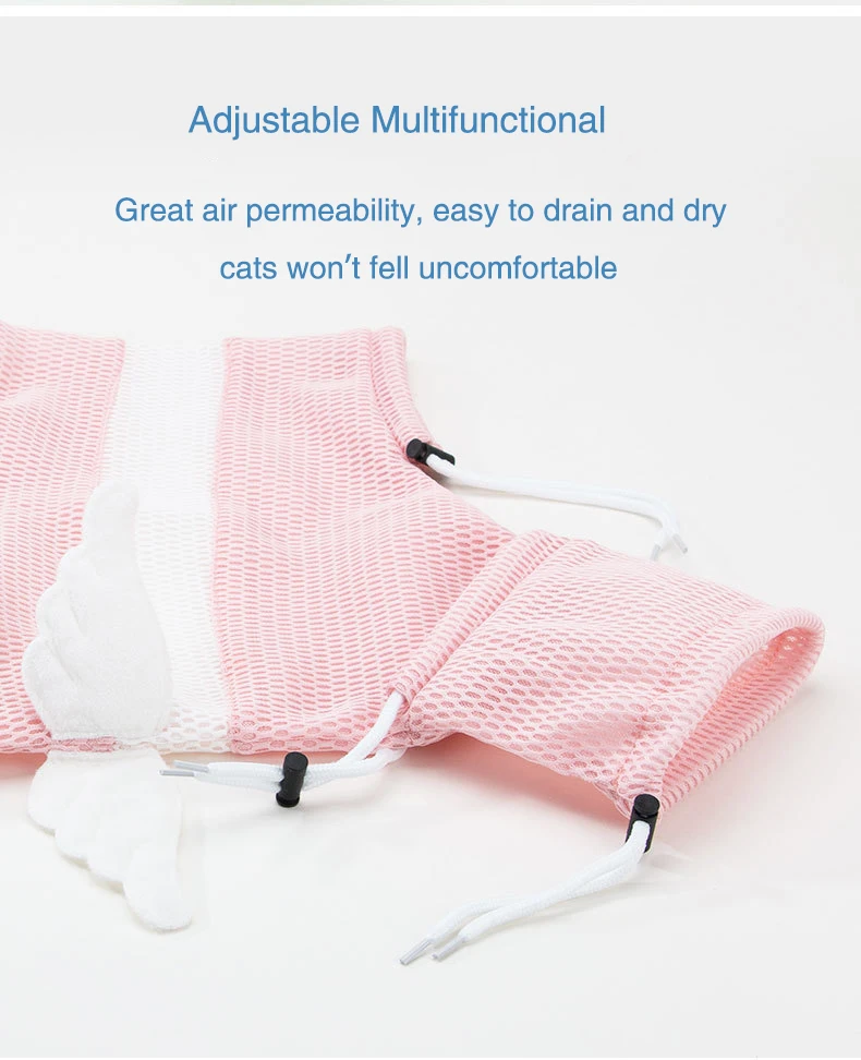 Creative Design : Washing Shower Mesh Bag with 4 drawstrings: Front and back drawstring prevent cat teeth, front and rear claws stick out to scratch people; Middle drawstring for better fix; Zipper allow you to release one paw at a time, easy to cut nails